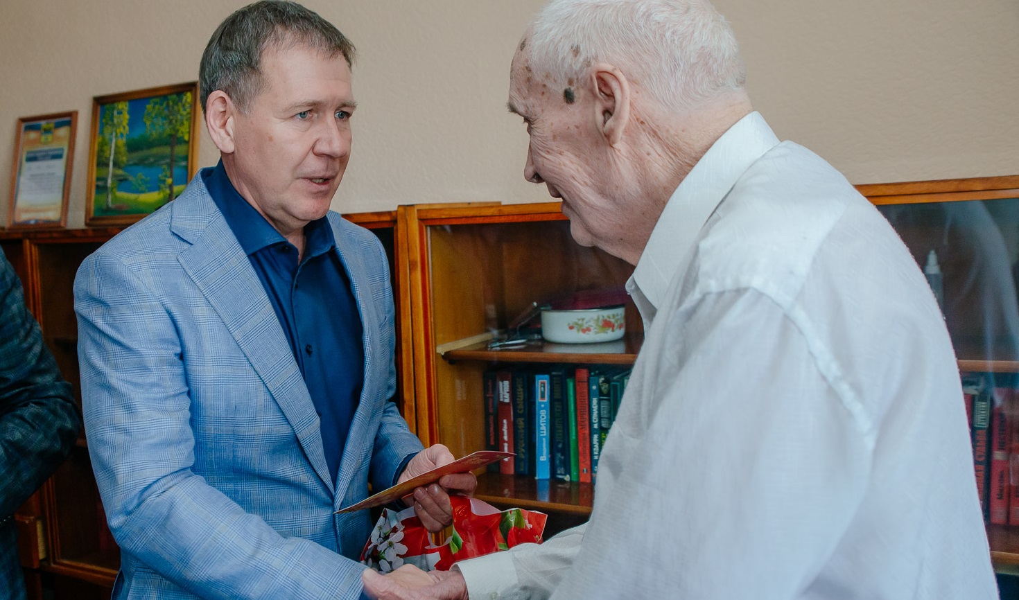 Навестить Ивана Петровича пришел вице-спикер областного парламента Александр Трубников. Вместе с депутатом горсовета Алексеем Чистяковым они вручили памятный подарок к юбилею Победы и пожелали самого главного – здоровья.
