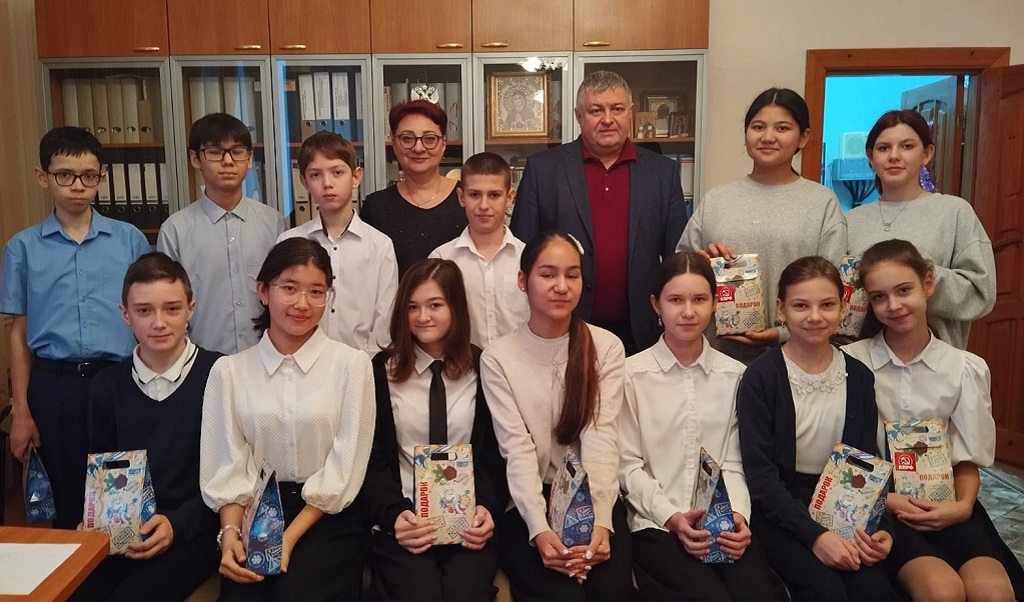 С Новым годом учащихся СОШ N1 им. А.С.Макаренко в Орске поздравил Владимир Гудомаров, и ребята были рады оторваться от занятий, чтобы получить сладкие подарки.