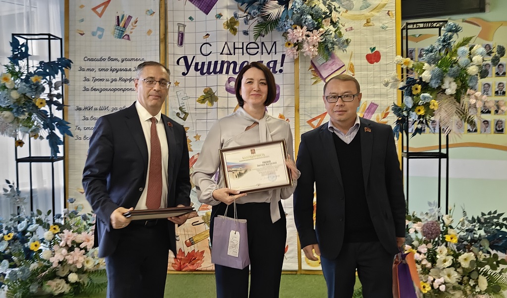 В преддверии праздника руководитель фракции КПРФ Максим Амелин и депутат ЗС Нурлан Мунжасаров поздравили учителей поселка Экодолье Оренбургского района и вручили им Благодарности председателя Законодательного Собрания области С.И.Грачева: