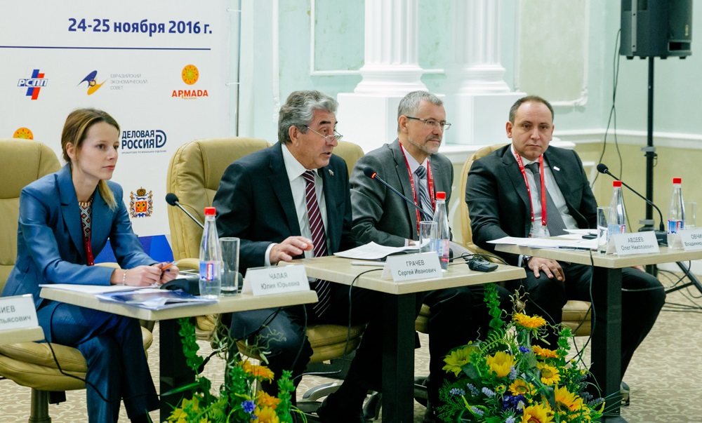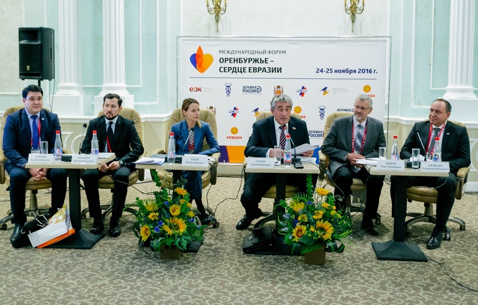 Во второй день форума «Оренбуржье - сердце Евразии» председатель Законодательного Собрания, председатель Правления Оренбургского регионального отделения Российского союза промышленников и предпринимателей Сергей Грачев провел заседание «круглого стола» на тему «Опыт поддержки экспортоориентированных предприятий в странах Евразийского Экономического Союза».