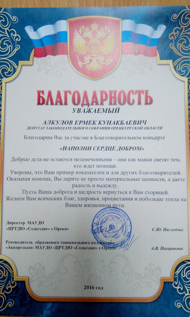 Благотворительный концерт «Наполни сердце добром», состоявшийся в орком Доме культуры железнодорожников, посетил председатель комитета Законодательного Собрания Оренбургской области по законности и правопорядку Ермек Алкулов.