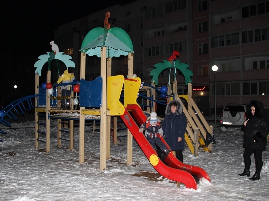 На участке между пятиэтажными домами появилась комфортная просторная зона отдыха для взрослых и детей: пешеходные дорожки, скамеечки, детский игровой и спортивный комплексы, беседка. По всему двору установлены фонари, высажены деревья, ели и кустарники. Весной на клумбах планируется высадить цветы и посеять газонную траву. Для автомобилей предусмотрены парковочные места на заасфальтированной стоянке. Последние работы по благоустройству территории были завершены в ноябре, но открытие дворика решили приурочить к Новому году.