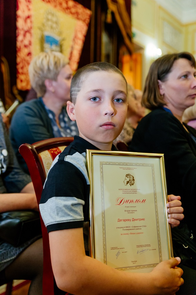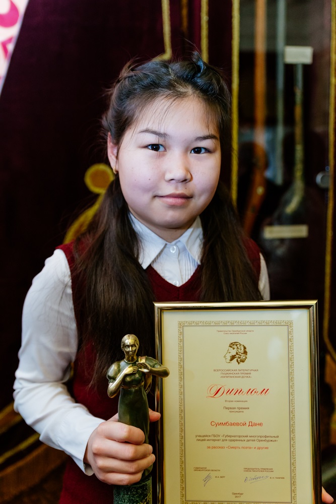 Статуэтку в виде главной героини «Капитанской дочки» Маши Мироновой вручили ученице губернаторского лицея Дане Суимбаевой за прозу «Смерть поэта». Диплом и денежную премию получили Мария Богданова из Новоорского района, Никита Сазонов из Бугуруслана, Виктория Симонова из Оренбурга, Ольга Шумакова из Бузулука. Самым юным победителем стал 10-летний Дмитрий Дегарев – жюри отметило его сказку «Лопух у дороги».