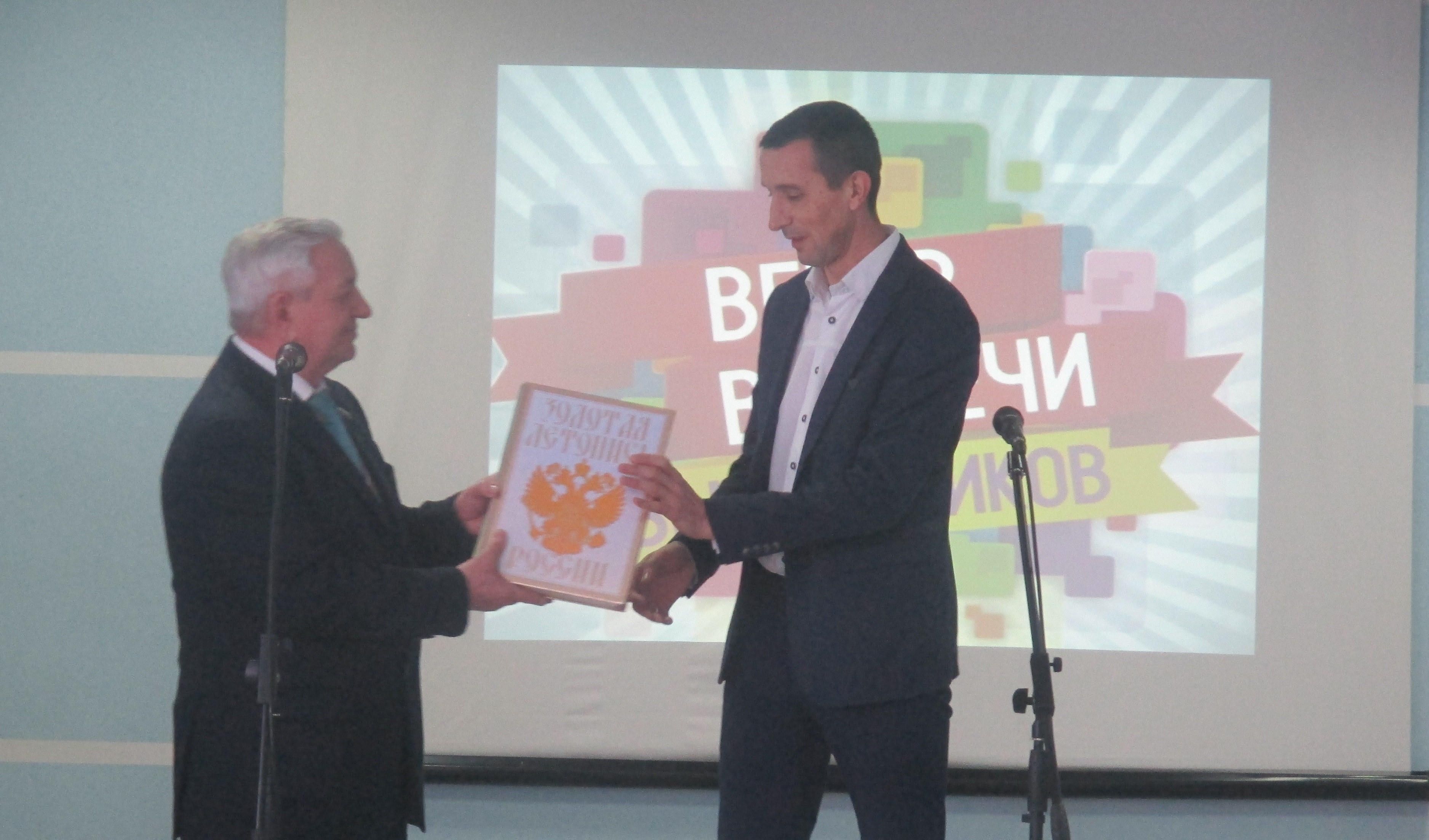 Выпускники 1970 года вручили подарки родной школе. Еще одним трогательным подарком стала авторская песня в их исполнении.