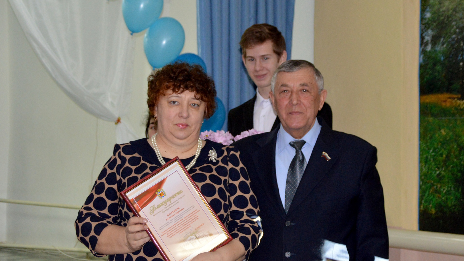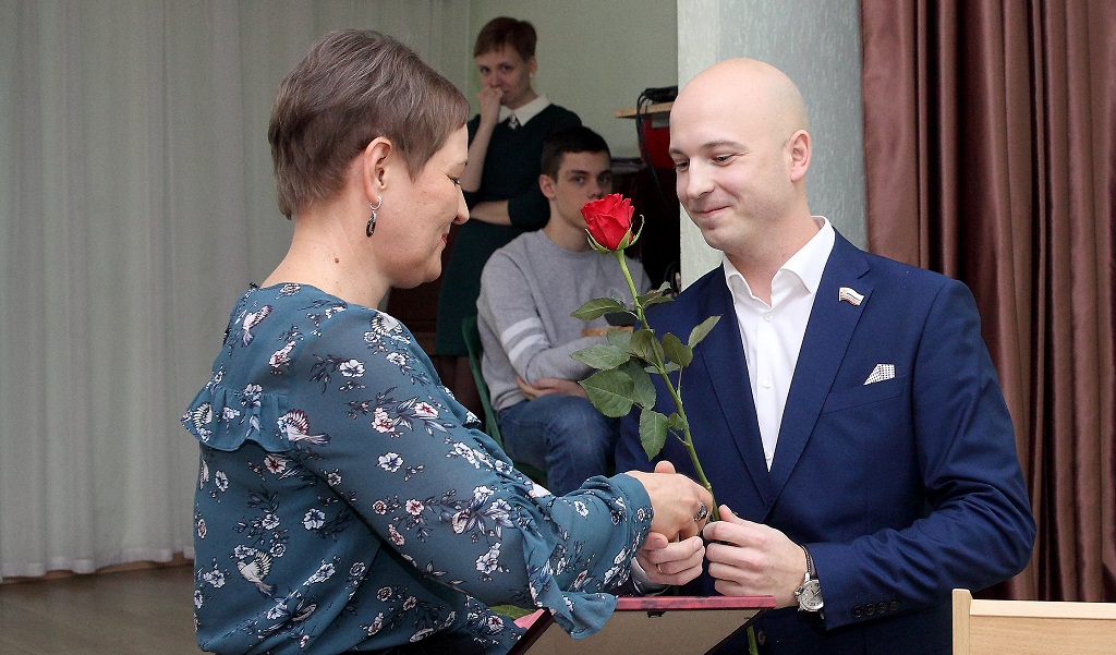 Алексей Панкратов вручил Благодарность председателя Законодательного Собрания С.И.Грачева директору школы Наталье Долматовой.