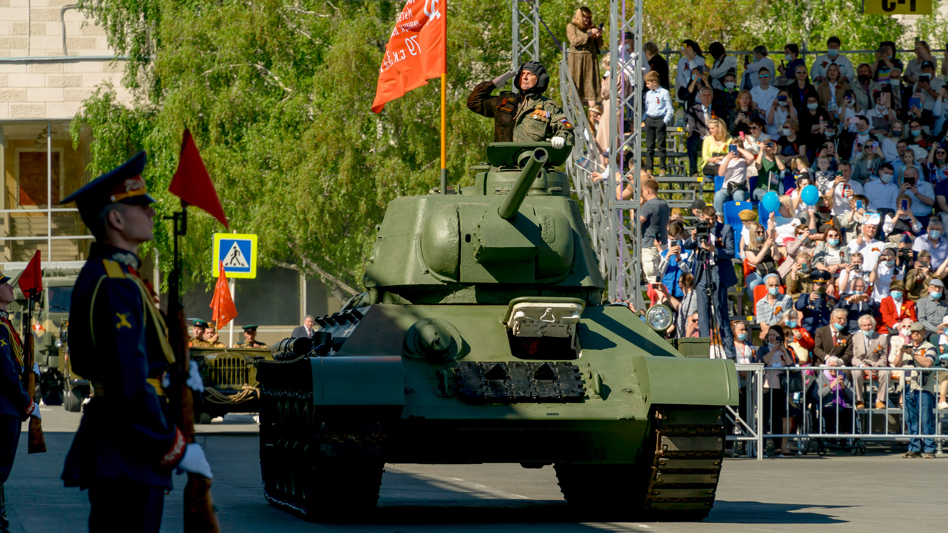 По главной площади прошли КАМАЗ с зенитной установкой, ремонтно-эвакуационная машина, "Смерч", прославленный в боях Великой Отечественной войны танк Т-34. В одной из таких машин погиб дядя Сергея Грачева.