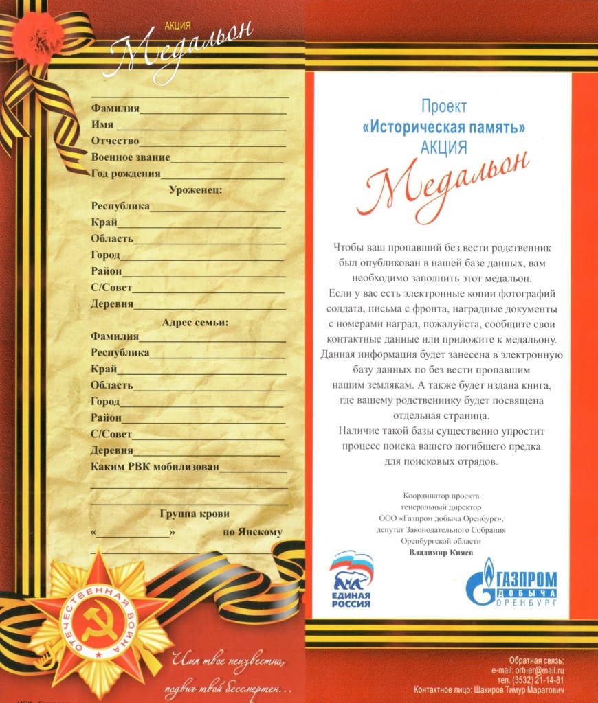 После спектаклей в областном драмтеатре каждый желающий, который хотел найти своих родных, без вести пропавших на фронтах Великой Отечественной, мог получить специальные бланки. Заполнив их, а также приложив фронтовые письма, фотографии, наградные документы, воспоминания о пропавшем, оренбуржцы тем самым помогут в создании базы данных без вести пропавших земляков и в поиске неизвестных солдат.
