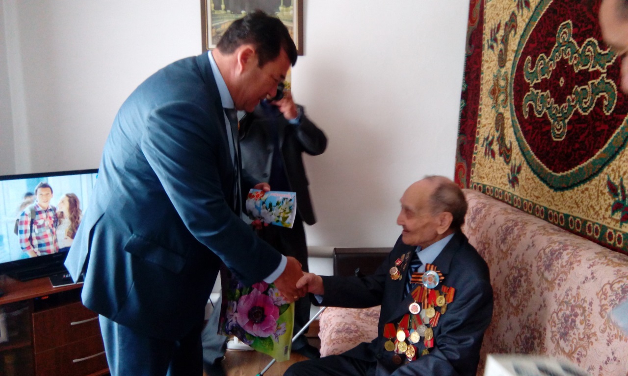 Ермек Кунакбаевич вручил участникам Великой Отечественной войны поздравительные открытки и памятные подарки.