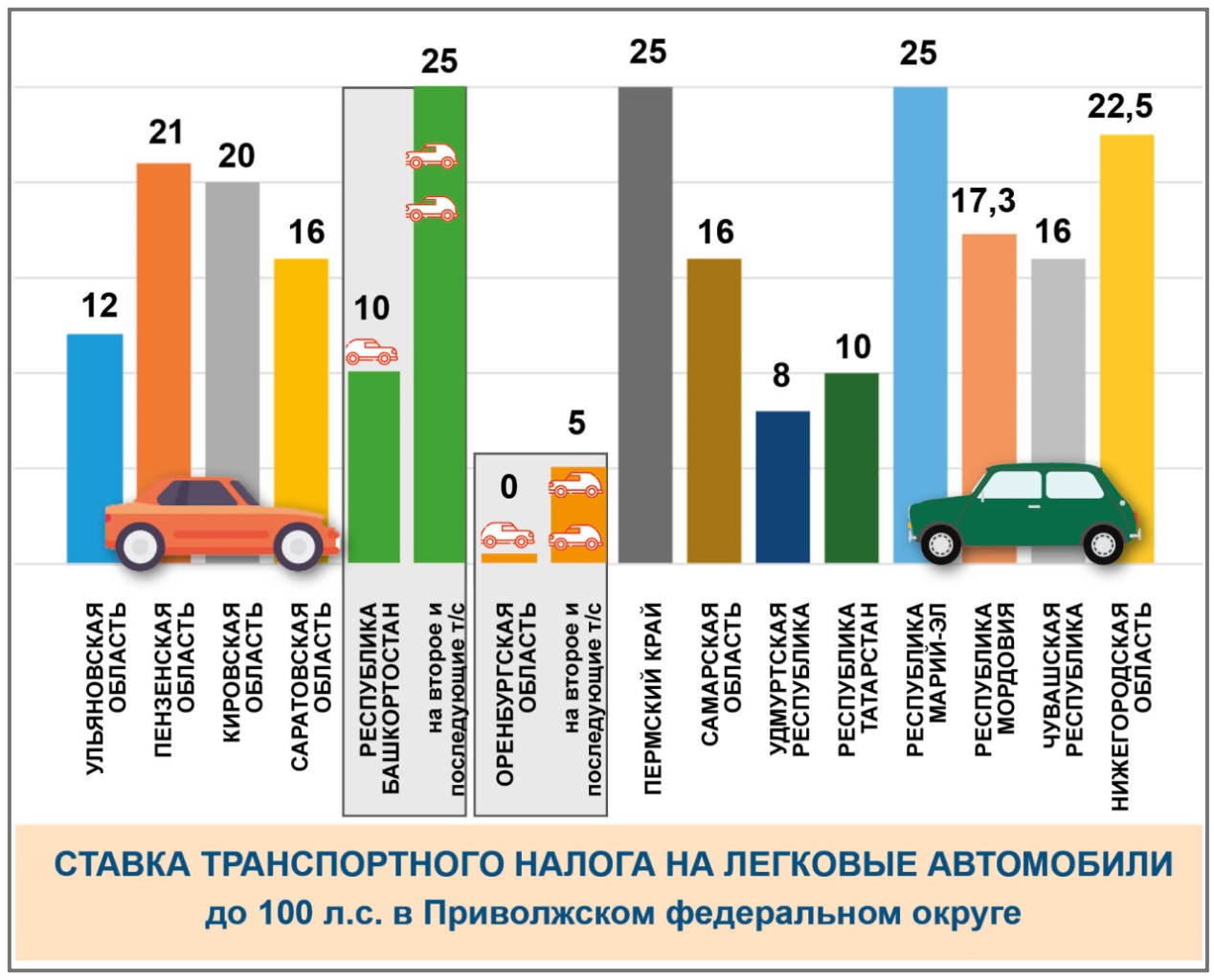 В Оренбургской области – единственном регионе в Приволжском федеральном округе – действует нулевая ставка транспортного налога на легковые автомобили до ста лошадиных сил вне зависимости от числа машин у владельца. Для сравнения – в Пермском крае и Республике Марий-Эл даже единственный автомобиль облагается налогом в 25 рублей за одну л.с.