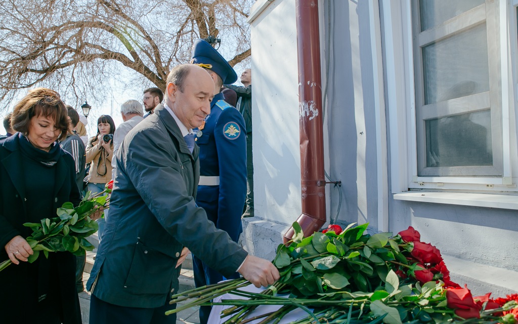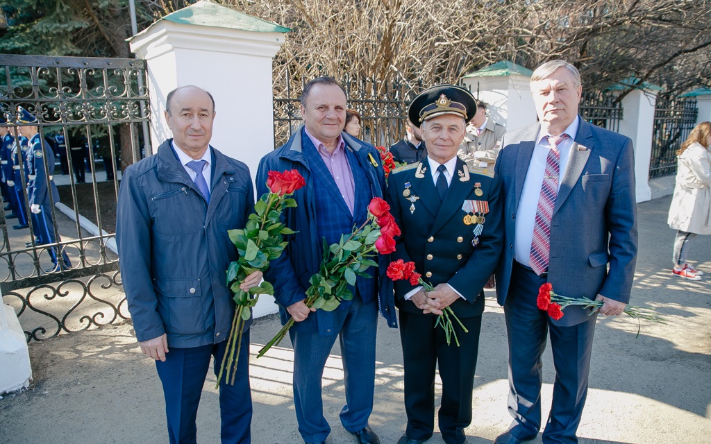 Парламентарии Виктор Купчик, Александр Спиридонов, Оксана Набатчикова, Владимир Новиков и Сергей Романенко возложили цветы к мемориальной доске Ю.А.Гагарина на здании Оренбургской кадетской школы-интерната им. И.И. Неплюева.