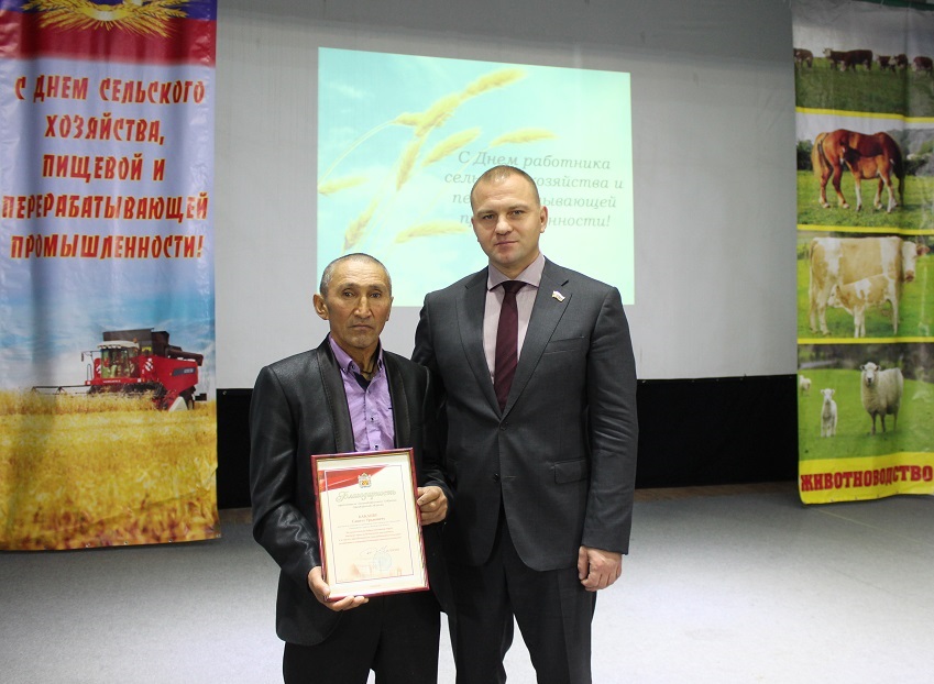 За многолетний добросовестный труд, высокие производственные показатели депутат вручил Благодарность председателя Законодательного Собрания Сергея Грачева животноводу ООО «Уральский» Савиту Бакаеву.