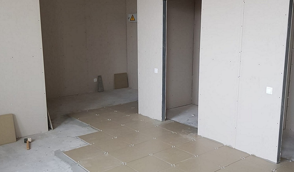 Ремонт помещения начат в апреле, но уже многое сделано. Проведена стяжка полов, выполнен монтаж пластиковых труб отопительной системы. Идет укладка электрокабеля, монтаж металлического каркаса для обшивки стен гипсокартонном, началась отделка. Строительные материалы завезены в достаточном количестве для бесперебойного ведения работ.