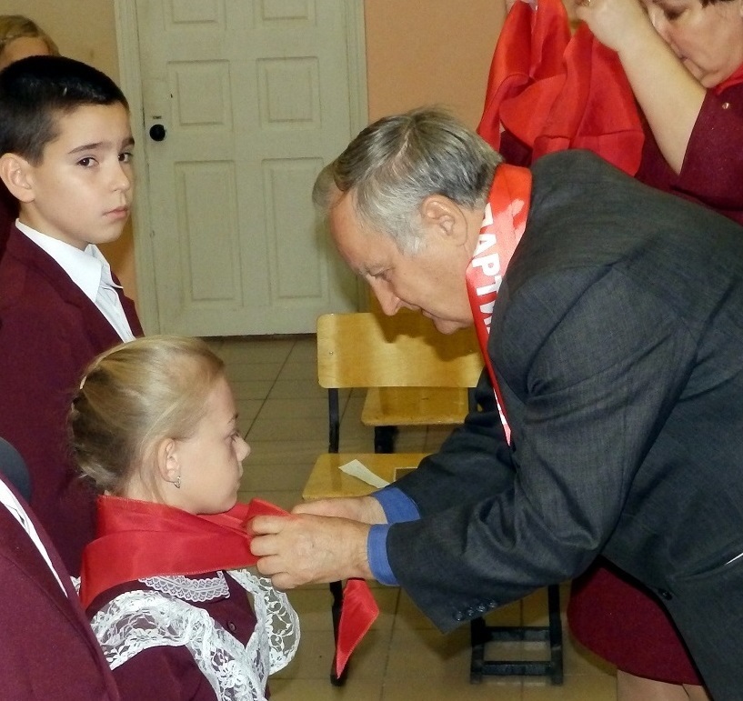 Владимир Новиков повязал ребятам пионерские галстуки и пожелал быть настоящими гражданами своей страны. Затем состоялся урок патриотизма, на котором депутат рассказал ребятам об истории Великой Октябрьской социалистической революции.