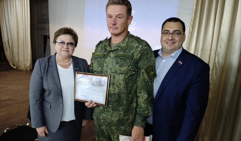 Депутаты Сергей Бабин и Ольга Хромушина в торжественной обстановке вручили награды заместителю командира войсковой части по военно-политической работе Максиму Губерны, заведующей клубом войсковой части Татьяне Ершовой и заместителю командира бригады по военно-политической работе – начальнику военно-политического отделения войсковой части Владимиру Зозуле.
