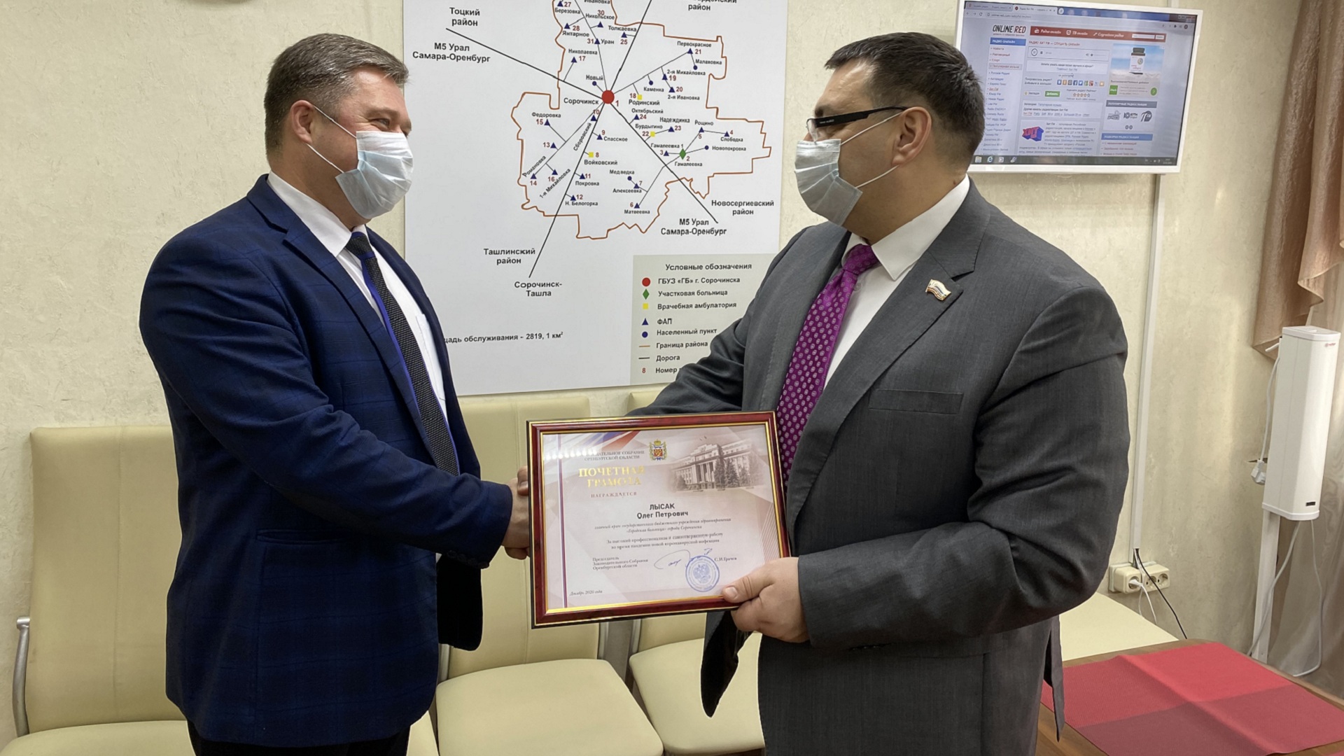 Сергей Бабин вручил Почетную грамоту Законодательного Собрания главному врачу городской больницы Олегу Лысаку, который возглавляет учреждение с января 2020 года. Благодаря ему оперативно был решен вопрос со средствами дезинфекции, защитными костюмами и масками, мониторами для контроля за состоянием пациентов, необходимым медоборудованием. В сентябре проведен капитальный ремонт с перепланировкой части помещения первого этажа в стационарном корпусе.