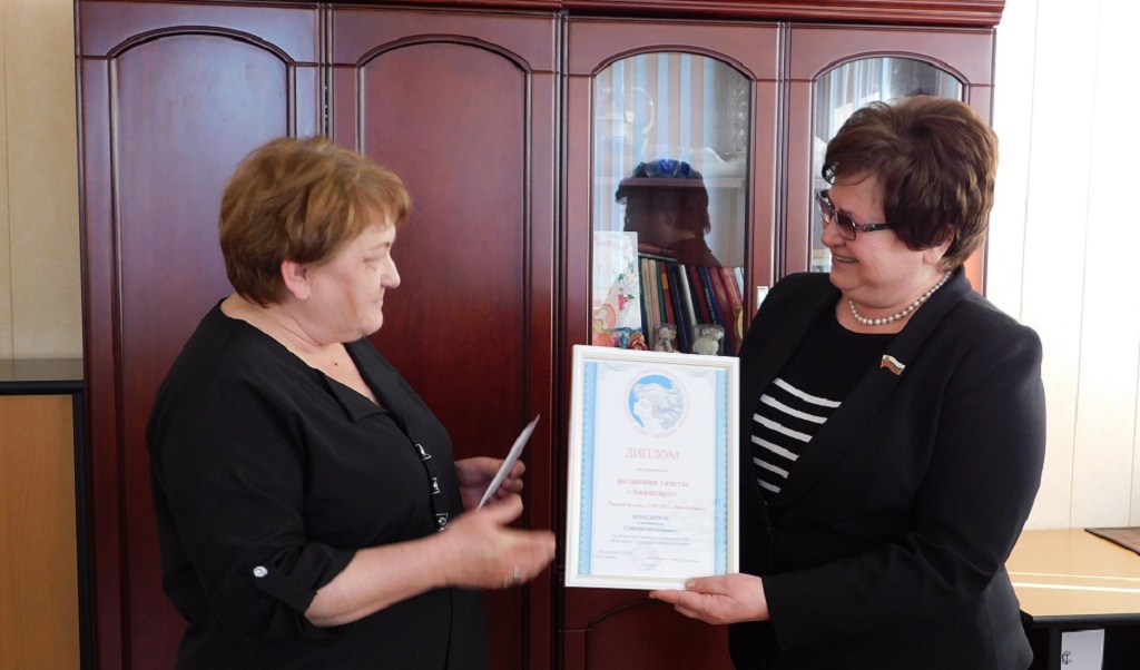 Депутат Законодательного Собрания, председатель областного Совета женщин Ольга Хромушина вручила главному редактору Галине Адодиной диплом победителя и денежную премию.
