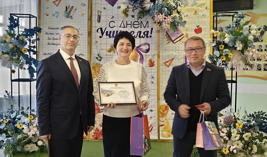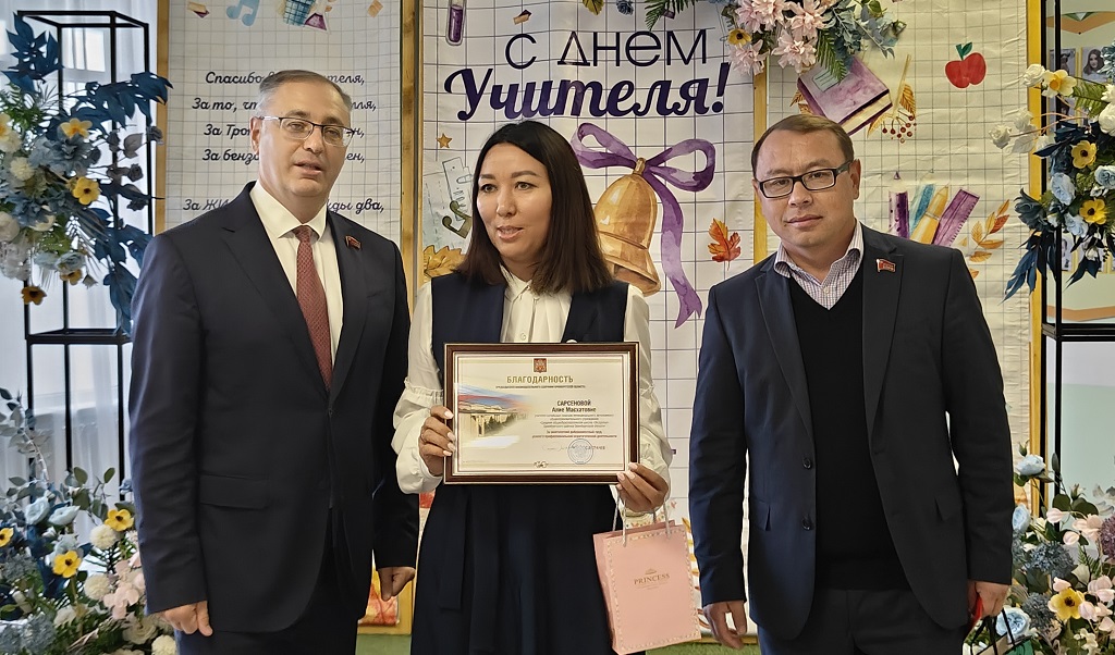 В преддверии праздника руководитель фракции КПРФ Максим Амелин и депутат ЗС Нурлан Мунжасаров поздравили учителей поселка Экодолье Оренбургского района и вручили им Благодарности председателя Законодательного Собрания области С.И.Грачева: