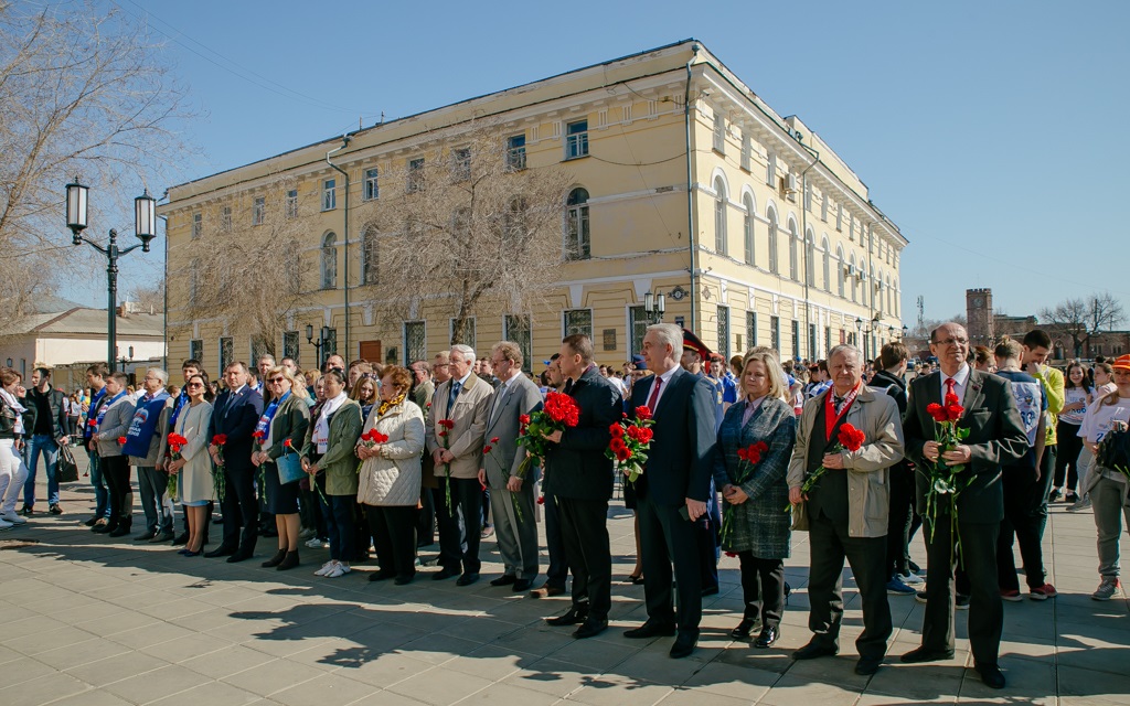 Участники традиционного торжественного митинга в областном центре, среди которых врио губернатора региона Денис Паслер, председатель Законодательного Собрания Сергей Грачев, вице-спикер областного парламента Олег Димов, депутаты ЗС Сергей Бабин, Евгений Сусоев, Оксана Набатчикова, Татьяна Иванова, Татьяна Казармщикова, Денис Зеленцов, Владимир Новиков собрались у памятника первому космонавту планеты, выпускнику оренбургской «летки» Юрию Гагарину.